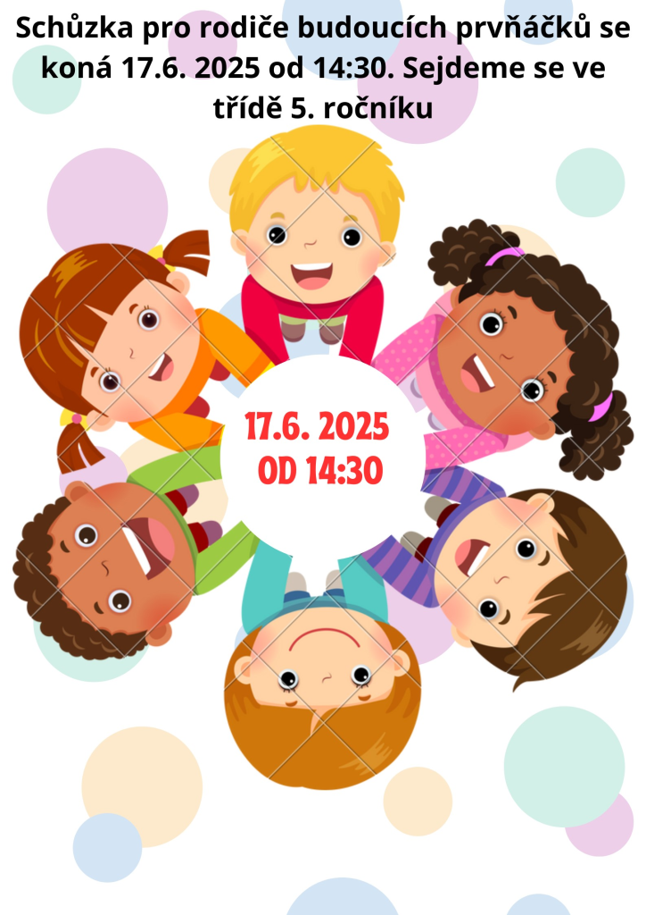 Schůzka pro rodiče budoucích prvňáčků se koná 17. 6. 2025 od 14:30. Sejdeme se ve třídě 5. ročníku.
