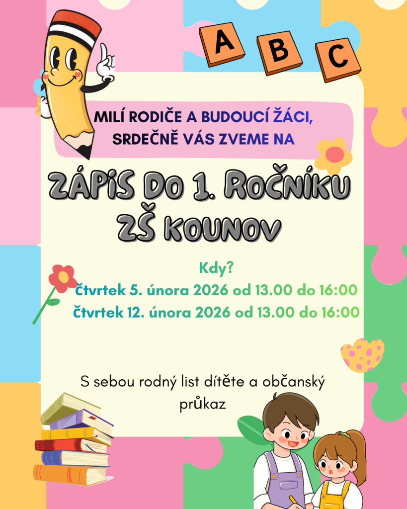 Milí rodiče a žáci, srdečně Vás zveme na zápis do 1. ročníku ZŠ Kounov.